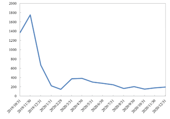 环评信用平台2019年11月启用以来,最初的几个月登记注册的环评编制单位数量较多,从2020年1月以后,每个月新登记的数量逐步平稳,基本稳定在200家左右,详见图2。
